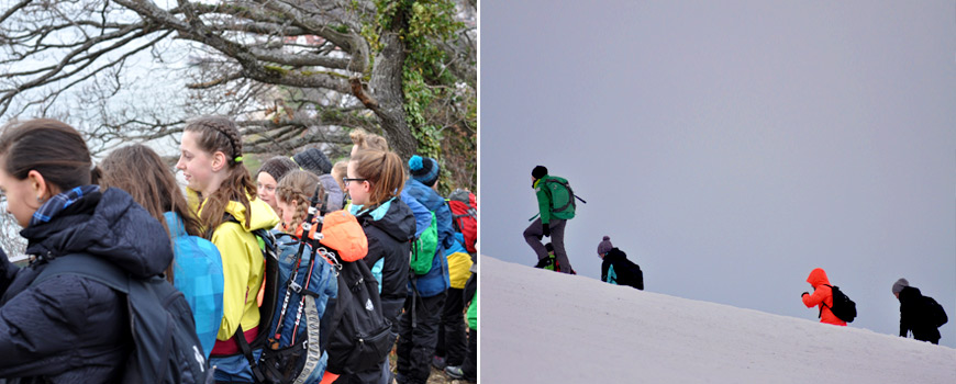 Die Schülerinnen und Schüler fuhren nach der 4. Stunde mit dem Zug von Friedrichshafen nach Lochau. Die Jugendlichen zeigten sich sehr motiviert und erreichten nach ca. zwei Stunden die Bergstation und den Gipfel des Pfänders. Das sehr kalte Wetter konnte die gute Stimmung in der Gruppe nicht trüben. Zurück ging es durch verschneite Wälder mit schönstem Blick auf den Bodensee.