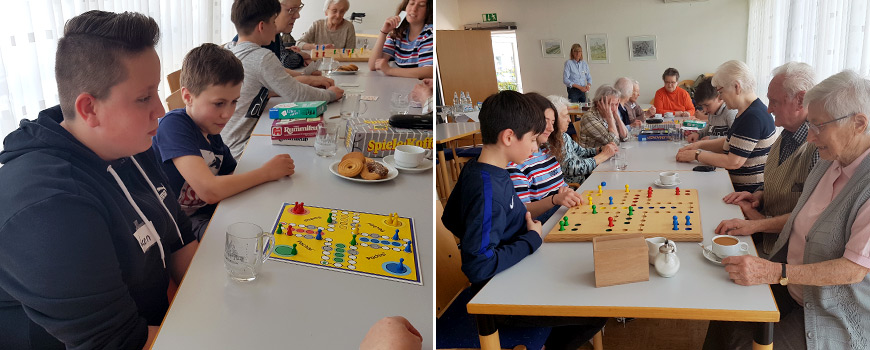 Am Dienstag, 17.04.2018 trafen sich Schüler der Realschule Ailingen und Bewohner der Seniorenwohnanlage in der Bodenseestrasse wieder zu einem Spielenachmittag. Bei Mensch-Ärgere-Dich-Nicht, Kniffel, Rummy Club, 11er raus und Memory wurde viel gelacht und miteinander geplaudert.