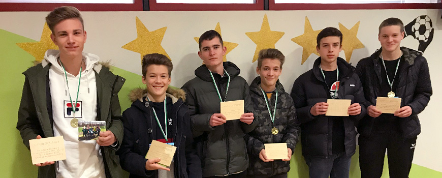 In diesem Schuljahr verlassen sechs Fußballer die Jugend-trainiert-für-Olympia-Bühne, mit denen ihr Trainer Stefan Hofmann in den vergangenen fünf-sechs Jahren tolle sportliche Erlebnisse genießen durfte: Lenni Schraff, Jonas Berger, Manuel Frank, Jannik Berger, Niklas Lanz, Xavier Rauch (von links nach rechts).