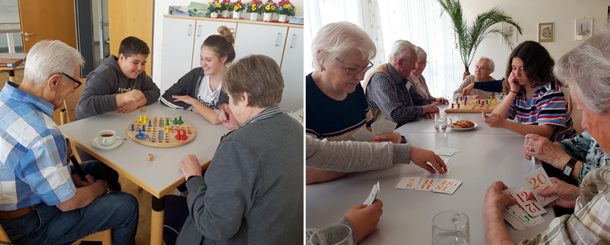 Am Dienstag, 17.04.2018 trafen sich Schüler der Realschule Ailingen und Bewohner der Seniorenwohnanlage in der Bodenseestrasse wieder zu einem Spielenachmittag. Bei Mensch-Ärgere-Dich-Nicht, Kniffel, Rummy Club, 11er raus und Memory wurde viel gelacht und miteinander geplaudert.