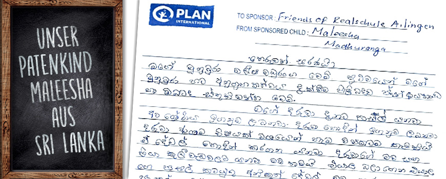 Auf die Religionsgruppe der Klasse 7 wartete zu Beginn des neuen Schuljahres eine große Überraschung: unser Schulpatenkind Maleesha aus Sri Lanka hat die Briefe der SchülerInnen beantwortet und uns damit gleichzeitig zahlreiche neue Aufgaben gegeben.