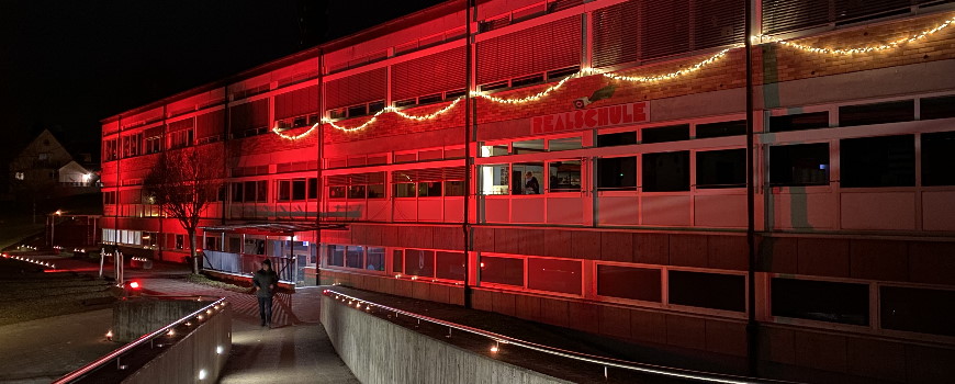 In weihnachtlichem Rot erstrahlte unser Schulgebäude am letzten Schultag vor den Weihnachtsferien. Bereits früh am Morgen verzauberte die SMV das Gelände mit hunderten von Lichtern und versetzte das Gebäude mit roten Strahlern in weihnachtliche Stimmung.